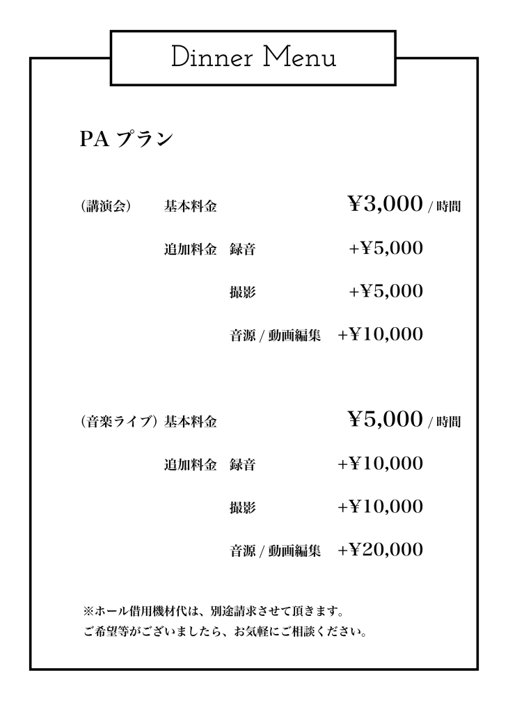 ※ホール借用機材は、別途請求させて頂きます。