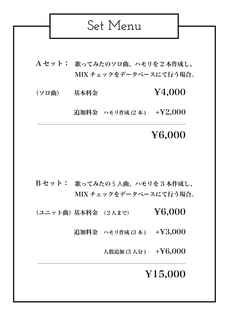 ボーカルのみ(歌入れ)と、リズム録り(Guitar/Bass/Drums/Key)によって、基本料金が異なります。