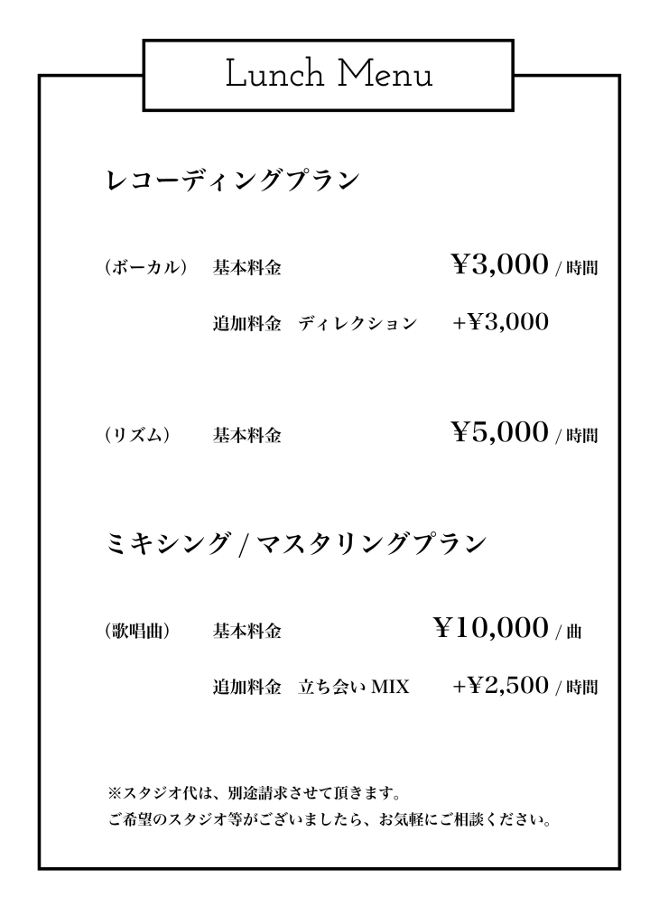 ※レコーディング/ミキシング/マスタリングプランすべて、スタジオ代は、別途請求させて頂きます。ご了承ください。